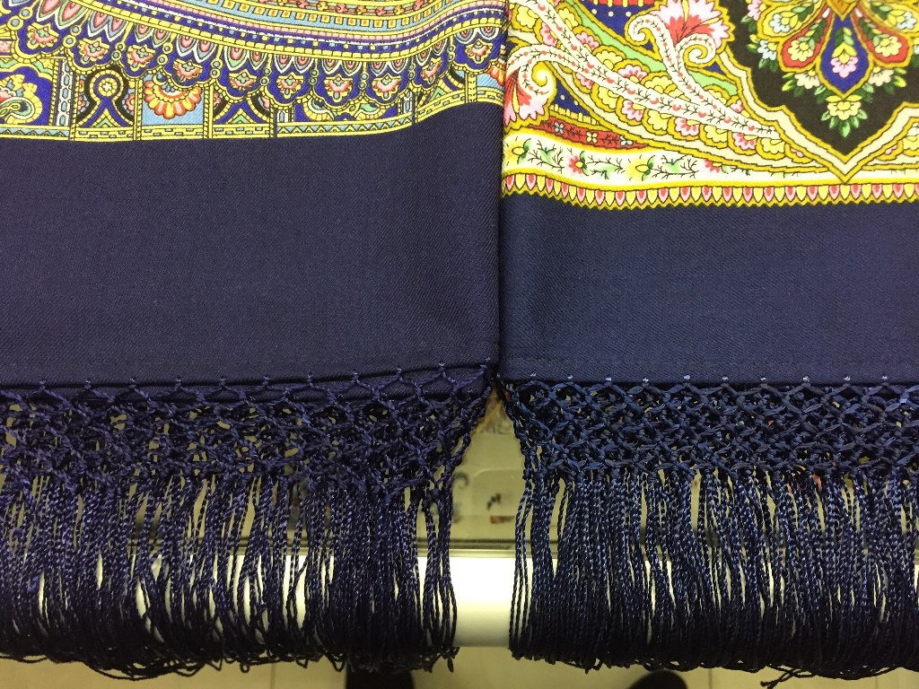 В реальности синий цвет каймы Султана чуть темнее и холоднее градуса на 2 :D (Кликните, чтобы почитать оффтопик)... . Бахрома на них разная, но у обеих шалей - в цвет каймы попадают. Яркие синие элементы похожи.