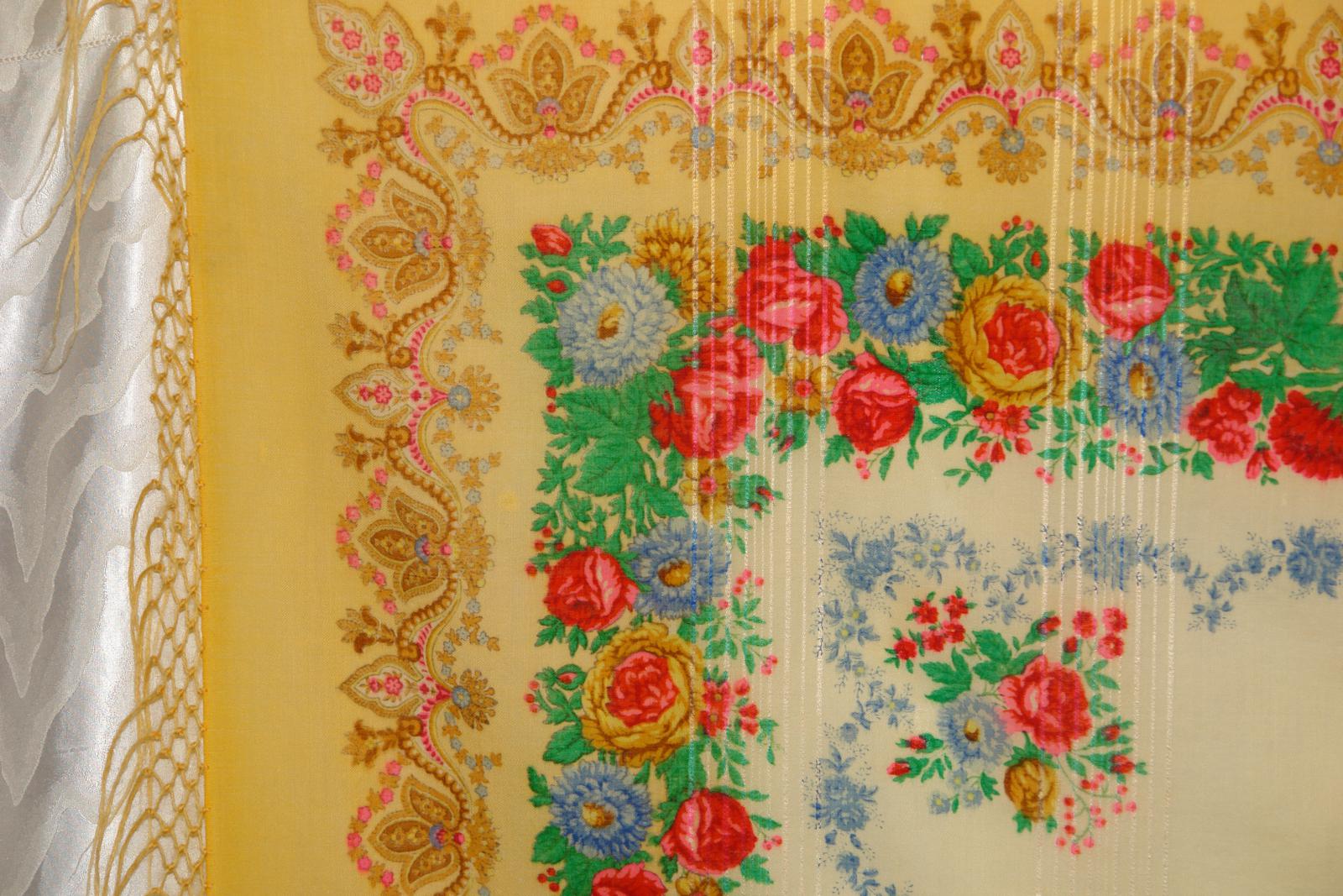У этой шали кайма яркого жёлтого цвета. Цвет каймы на фотографии передан точно, а средник оказался немного светлее реального нежно-кремового