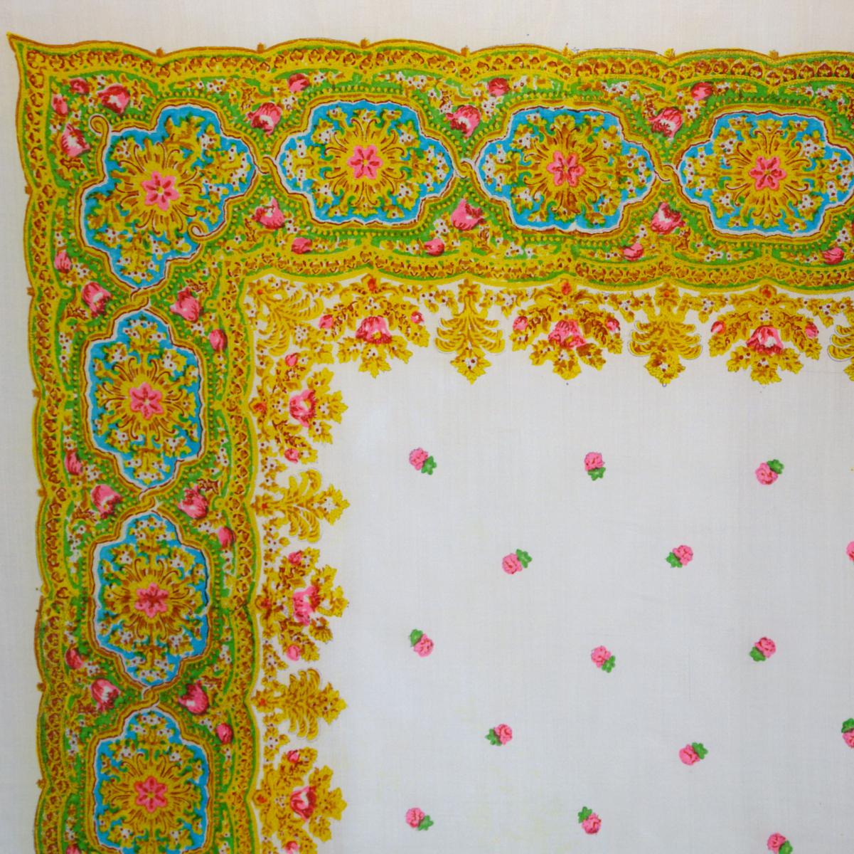 У этой шали кайма яркого жёлтого цвета. Цвет каймы на фотографии передан точно, а средник оказался немного светлее реального нежно-кремового