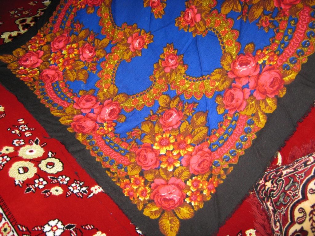 И, напоследок, покажу еще один большой с шерстяной бахромой платок 146 или 148, названия которого не знаю. Его носит сейчас 20-летняя девушка, внучка той женщины, на плечах которой я запечатлела "веселенькую" такую "Ностальгию" - по наследству перешел, видимо. Сказали, что очень давно его покупали. Почему-то мне кажется, что с названием это платка вы, дорогие шалелюбушки, определитесь сразу. Ну вот такой у меня получился показ сегодня :D . Если успею, покажусь еще сама в "Примерочной".