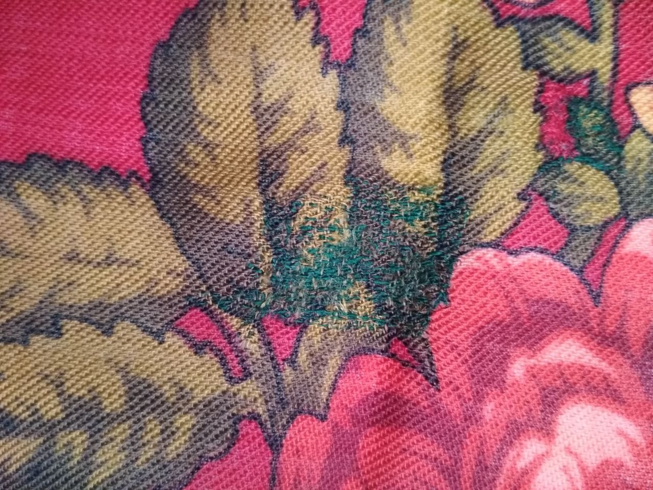Моё « лечение « дыр не оригинально. Приехал платочек новый и желанный с 2 заштопанными дырочками ( примерно в 1 см). Решила срезать штопку, уменьшить платок. Да, жалко, но как ни крути, штопка всегда оказывается на видном месте и я ее вижу! Наверное моль порезвилась ( хорошо, что в 2 местах), по ткани и бахроме видно, что платок новый и часть этикетки есть.