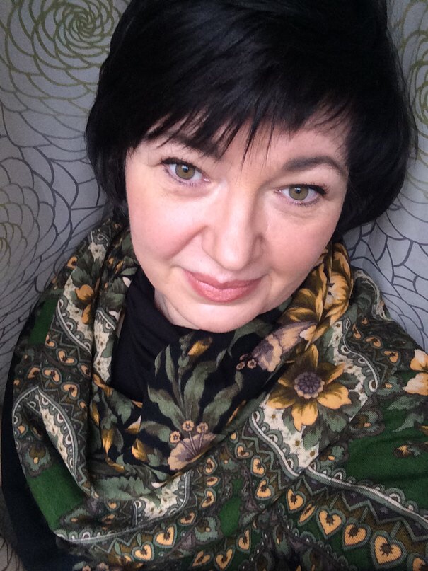 Нина Александровна, ярчайшая линия продолжена вами великолепно! Мне образ на второй фотографии больше всего понравился. Где платок представлен скруткой, ярким штрихом в паре с беретиком. Что-то французское в этом появилось, и сразу мне нравится. А хороша Любава-то! Чудо-платок. И прекрасно выбран фон - тёмно-зелёный простой джемпер. И вам очень идёт этот цвет помады.