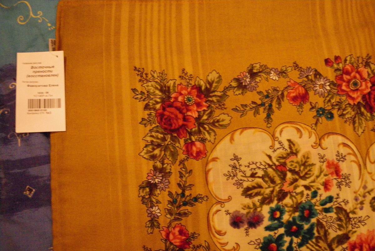 Попробовала подвернуть кайму, оставив только пару сантиметров - платок засветился, букеты "вынырнули" из каймы и заиграли.