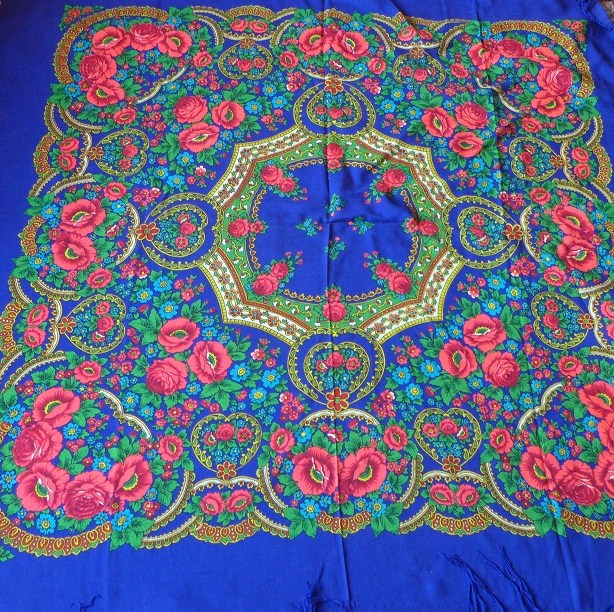Хочу показать и я свое последнее приобретение. Я платки в последнее время практически не покупаю, но в эту шаль влюбилась с первого взгляда, бегала на нее смотреть и в конце концов купила, не удержалась. Шаль туркменская, есть даже надпись - обожаю вязь, загадочные буквы, теперь у меня и шаль и кольцо есть с восточными надписями вязью. Но художник, мне кажется, павлопосадский и у меня даже есть подозрение на одного, но пока не буду высказывать, подожду, может быть, понимающий народ выскажется. Характер шали - сдержанный, элегантный, немного торжественный и я, бы сказала, концертный. Уже вторая у меня туркменская сдержанная красотка. Набойка ручная, на мой глаз. Прошу любить и жаловать.
