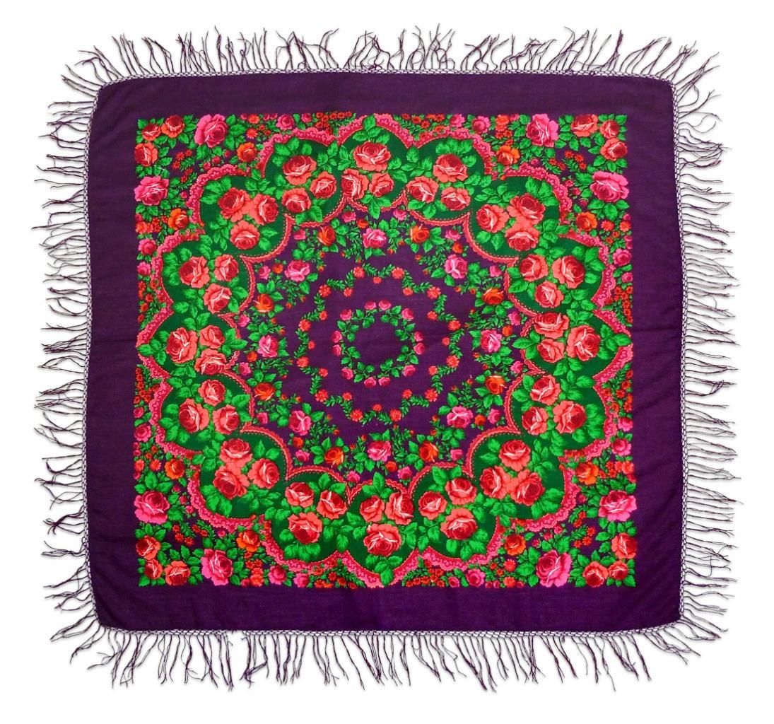 Шаль 130х130 с традиционными русскими розами, орнаментом и.... шикарными угловыми павлинами