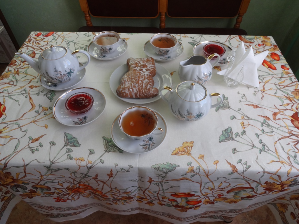 Как только сайте "Платки.ру" появилось фото скатерти "Осенние дары" решила, что обязательно её куплю. И вот наконец-то свершилось. Домашнее чаепитие с городецким пряником и вареньем из крыжовника.