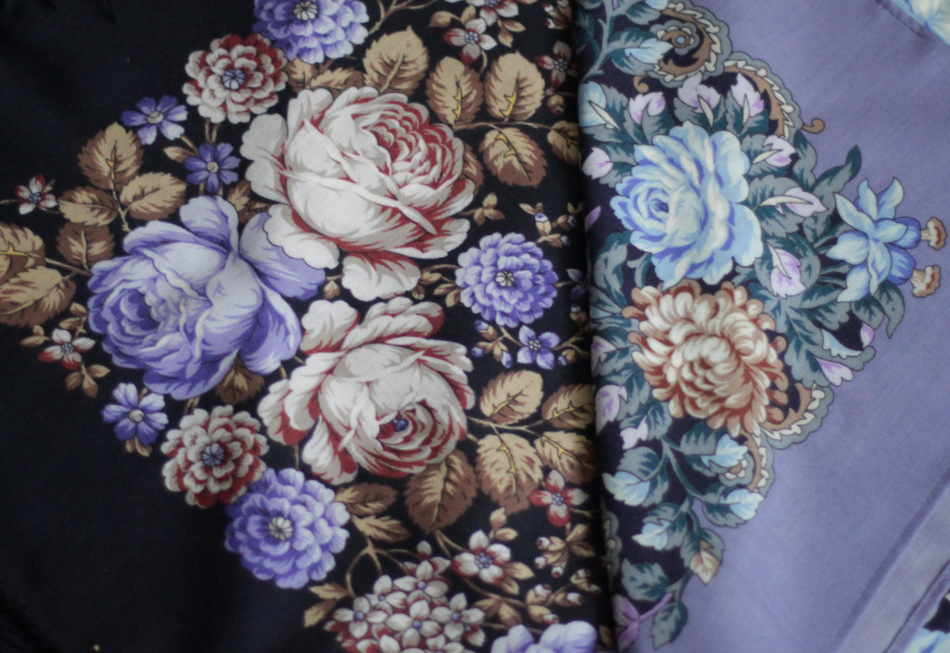 И вот странный "перевёртыш" в номерах колоритов. Номер колориту присвается по цвету каймы, и Цветочная сказка имеет номер синих платков - 14, а Утомлённое солнце номер платков фиолетовых - 15, но общее впечатление от цветовой гаммы платков создаётся противоположное - Цветочная сказка фиолетовая, а Утомлённое солнце - синее.