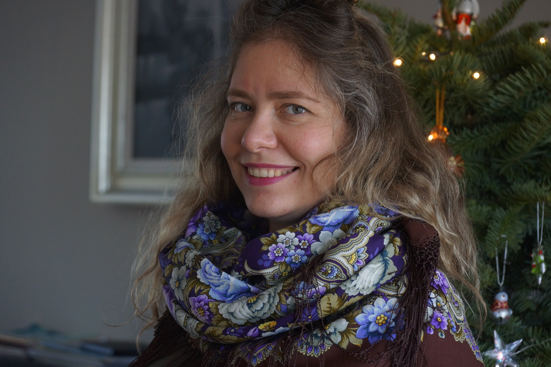С удивлением заметили что на мне и Ирине доминируют разные цвета. На Ирине нежно голубой и фиолетовый, а на мне персиковый.