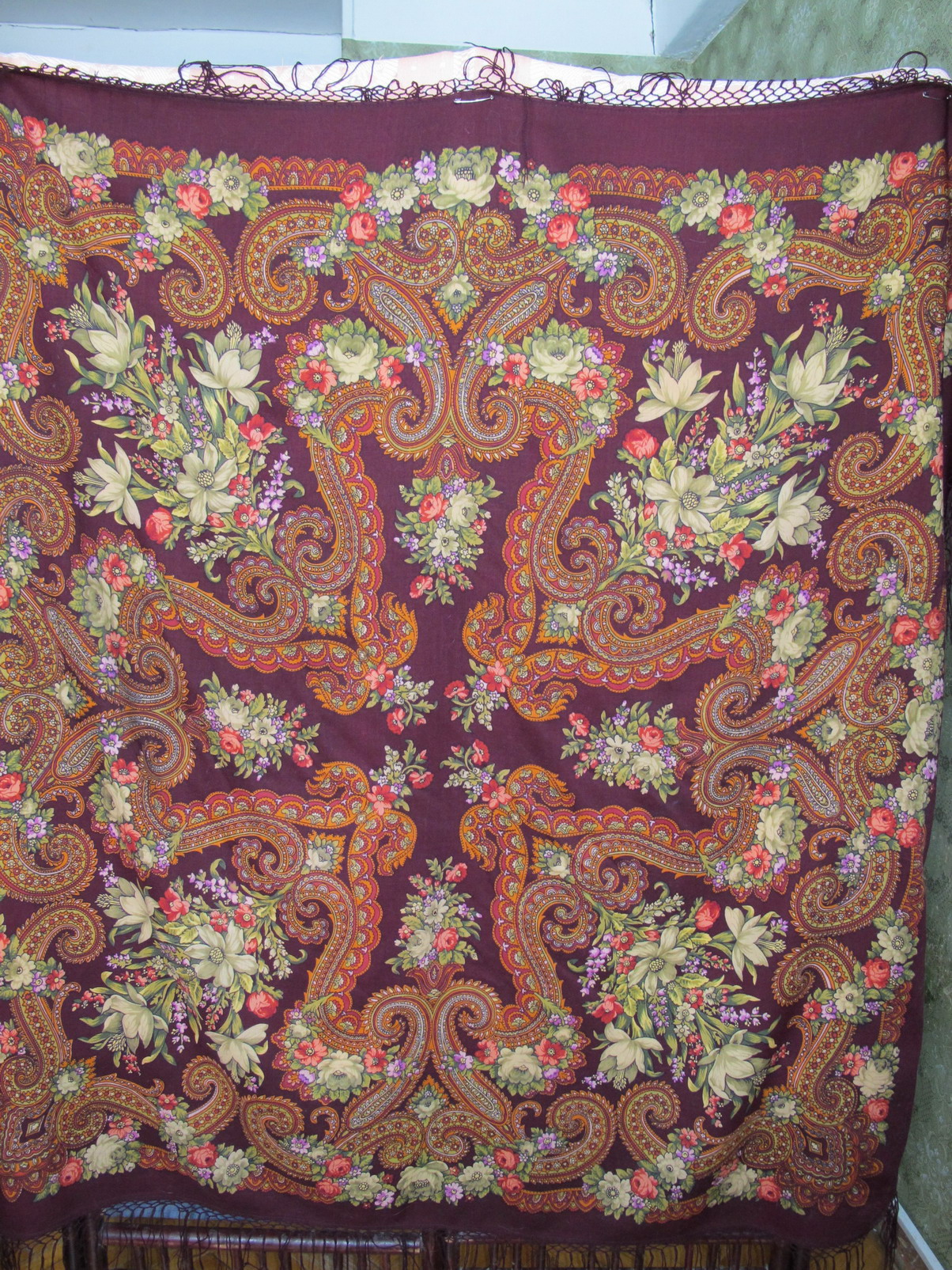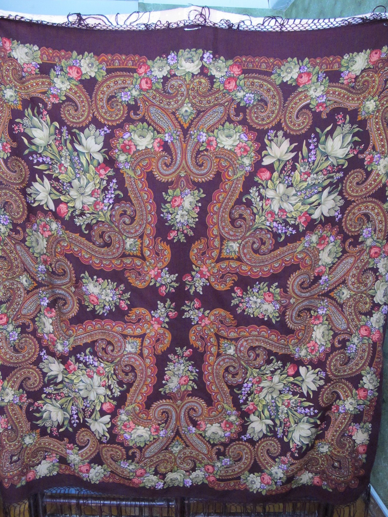 Она писала, что был куплен в 1995 году. По-моему, это не уплотненка, у Лунного света ткань толще, а у Белых лилий плотнее, хотя современные 146х146 потоньше будут. Фон бордовый, такие сейчас 7-ми нумеруются, при искусственном освещении коричневый, а розы горячие, как угольки.