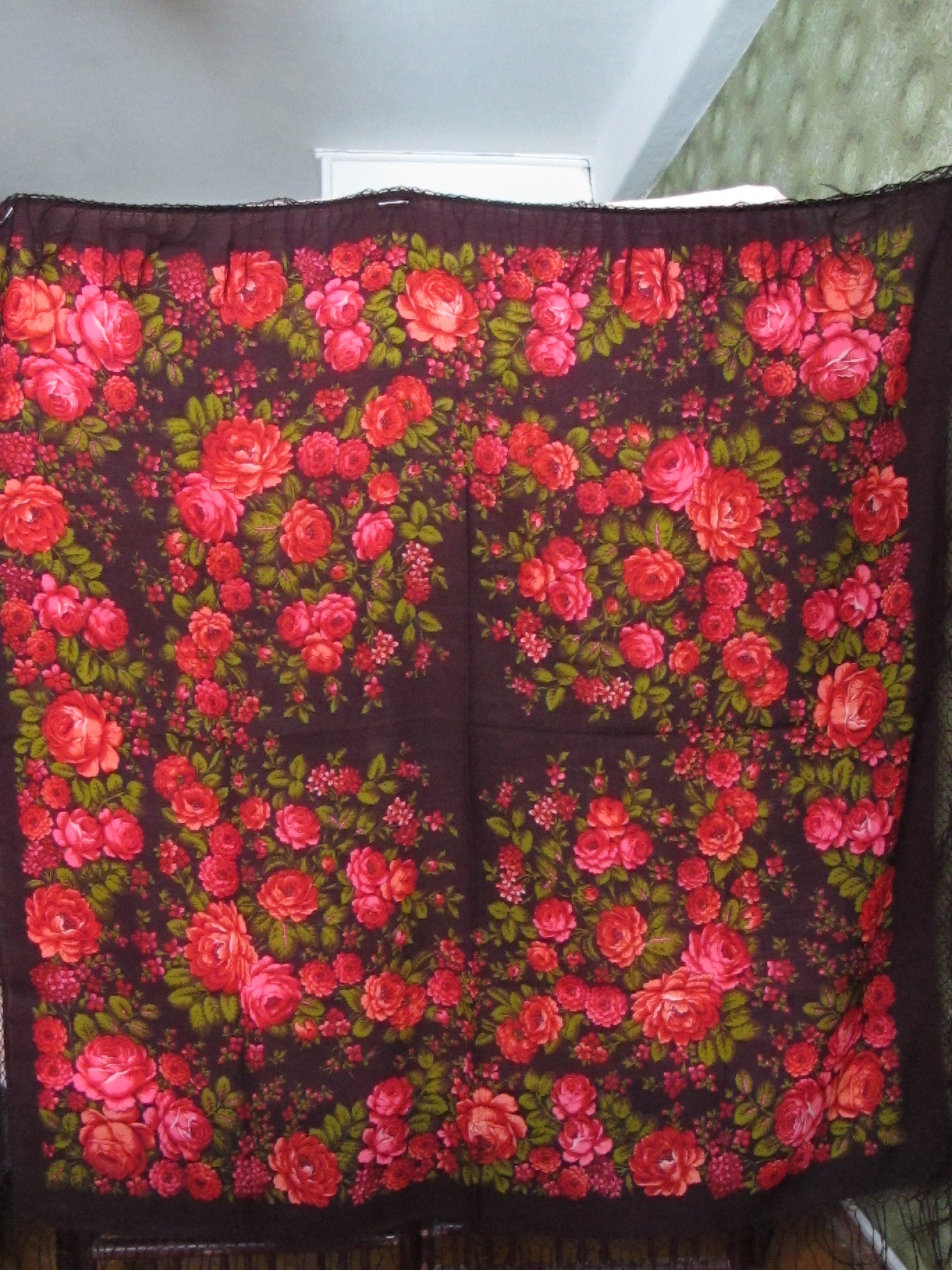 Она писала, что был куплен в 1995 году. По-моему, это не уплотненка, у Лунного света ткань толще, а у Белых лилий плотнее, хотя современные 146х146 потоньше будут. Фон бордовый, такие сейчас 7-ми нумеруются, при искусственном освещении коричневый, а розы горячие, как угольки.