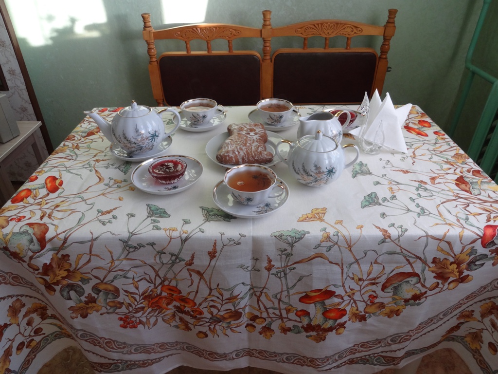 Как только сайте "Платки.ру" появилось фото скатерти "Осенние дары" решила, что обязательно её куплю. И вот наконец-то свершилось. Домашнее чаепитие с городецким пряником и вареньем из крыжовника.