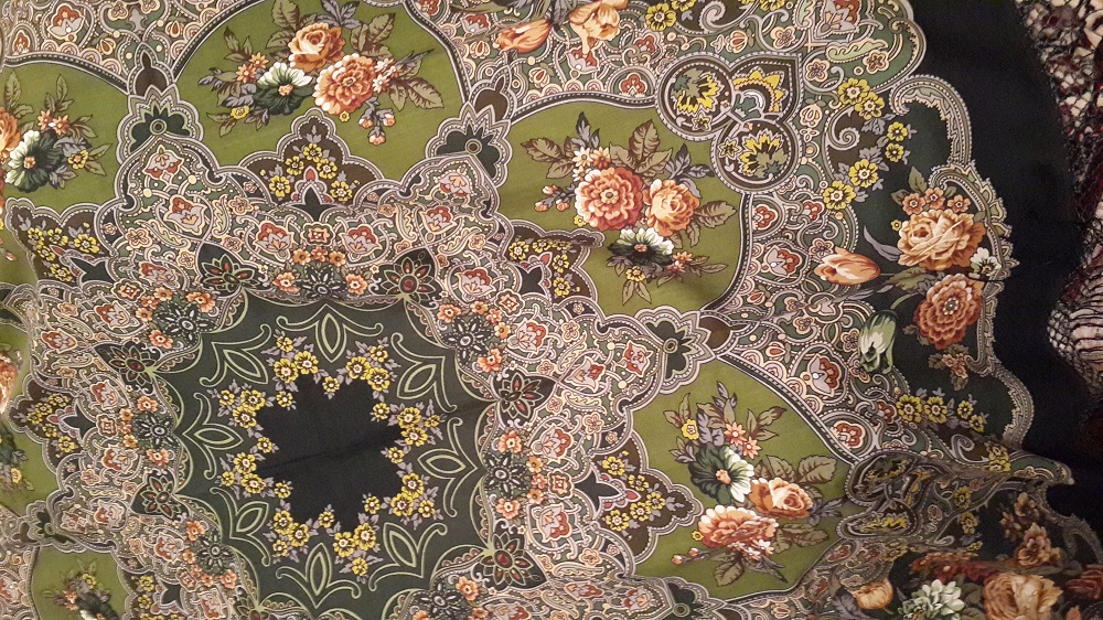 Радоница-30 -благородно -сдержана, Цыганка Аза -10 - яркая, сочная, но не вызывающе пестрая, а приятная,свежая. И серединка в ней - мёд, свежий башкирский мед. Георгинка с легким оранжеватым подтоном и такой нежный, ласково-розовый тюльпан. Оличная шаль.