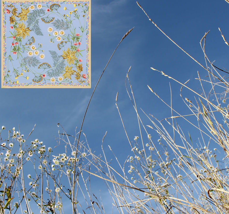 boulangerie писал(а):... А сейчас хочу показать самый простой коллаж с шёлковый малышом "Разнотравье" в голубом небе. Фотография неба моя. Это я в