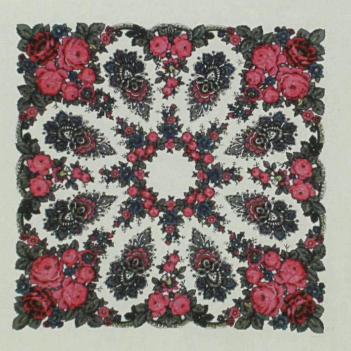 "Нашла прототип этой шалечки - в книге "Russian kerchiefs and shawls", изд. "Аврора", 1985 г. Это шаль 1820-40 годов, выполненная в технике ручного ткачества (предположительно, колокольцовская шаль), размер 158,5х154,5.
