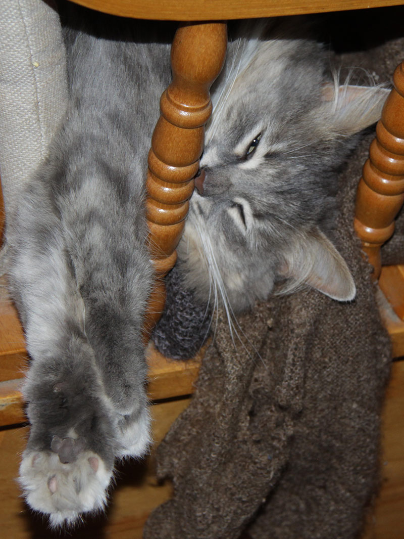 Sania, это кресло-качалка, Азя лежит поперек кресла, вот лапы и не поместились, греет пузо у камина, осенью снимала на даче. Почему-то мои коты совсем не боятся огня, по осени любимое место было или так, в кресле около камина, или еще ближе, на полу вплотную к нему. При том, что там огонь настоящий полыхает, а котам только кайф, впитывают тепло, даже шерсть теплой делается.