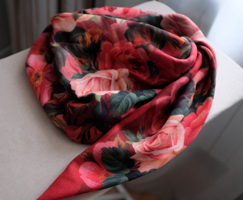 А это тот платочек, который был из самой первой партии. Потом, если помните, они изчезли из продажи и появились на другой ткани. Я видела в магазине этот же платок уже на новой ткани - он стал темнее, насыщеннее. Мой совсем бледненький, "застиранный", но мне в этом рисунке это нравится.