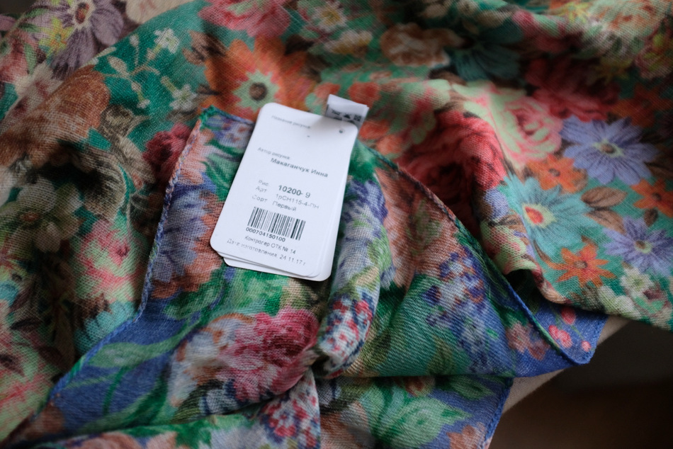 А это тот платочек, который был из самой первой партии. Потом, если помните, они изчезли из продажи и появились на другой ткани. Я видела в магазине этот же платок уже на новой ткани - он стал темнее, насыщеннее. Мой совсем бледненький, "застиранный", но мне в этом рисунке это нравится.