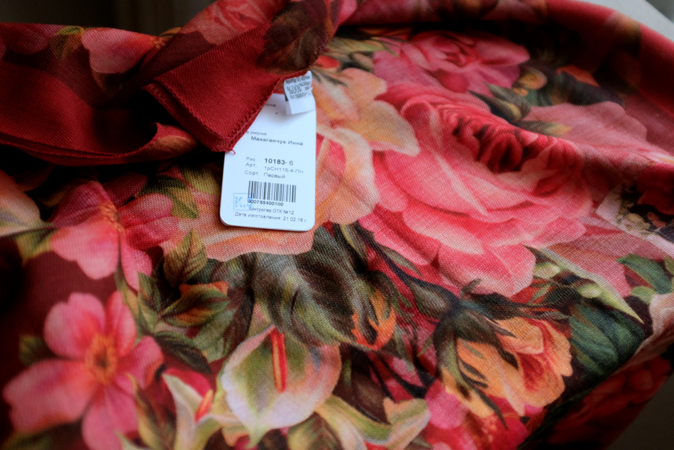 А это тот платочек, который был из самой первой партии. Потом, если помните, они изчезли из продажи и появились на другой ткани. Я видела в магазине этот же платок уже на новой ткани - он стал темнее, насыщеннее. Мой совсем бледненький, "застиранный", но мне в этом рисунке это нравится.