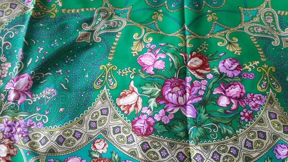 А это тот платочек, который был из самой первой партии. Потом, если помните, они изчезли из продажи и появились на другой ткани. Я видела в магазине этот же платок уже на новой ткани - он стал темнее, насыщеннее. Мой совсем бледненький, "застиранный", но мне в этом рисунке это нравится.