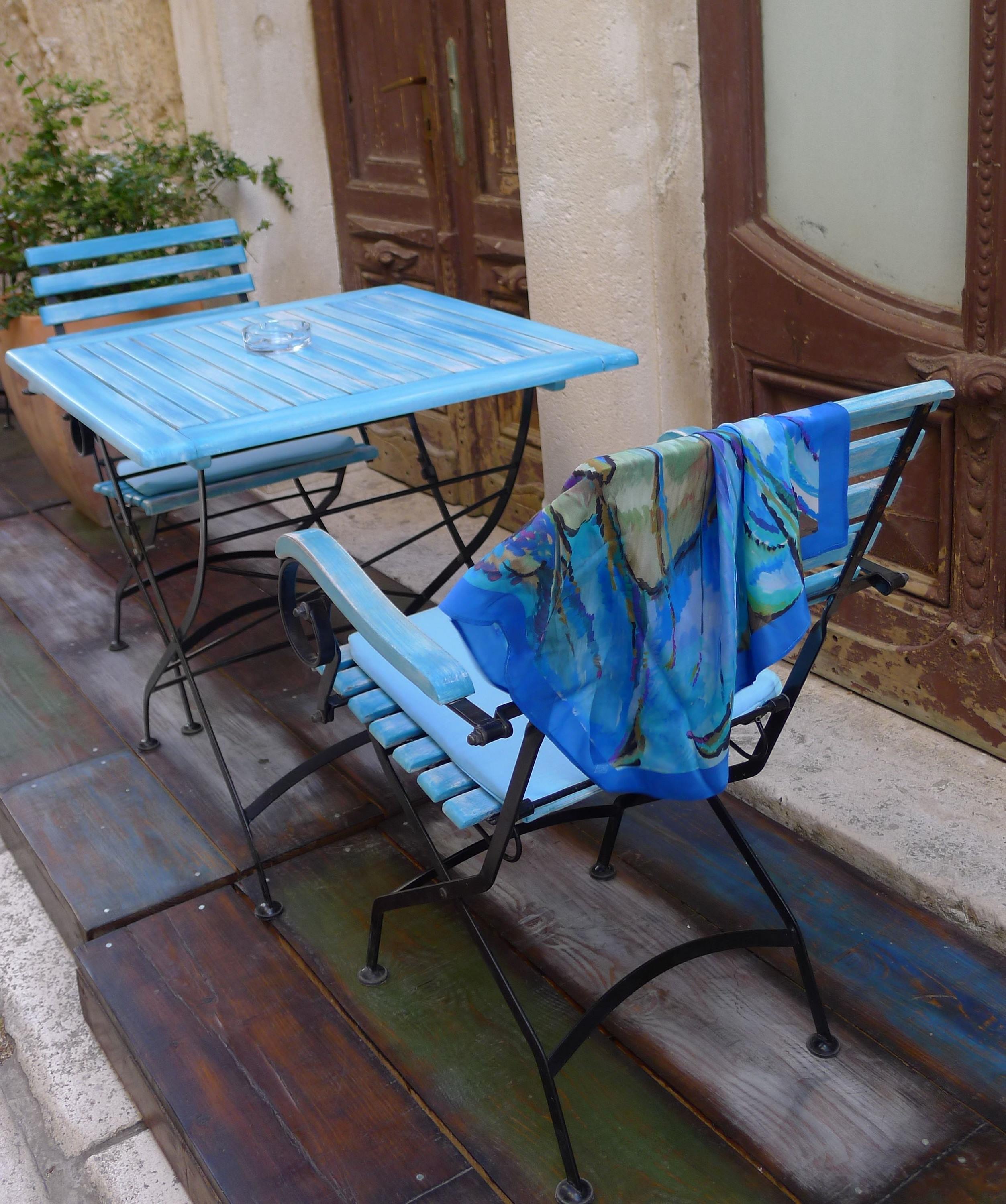 Платочек, пронизанный ветром странствий, в котором бирюза моря, синева неба, белизна парусов, хвоя и кора прибрежных сосен, запахи мирта, розмарина, кофе из уличных харчевен, разлитая кругом атмосфера праздности и неги.