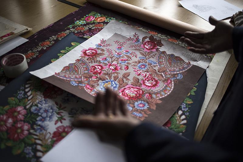 Сырье для производства тканей предприятие закупает на Троицкой камвольной фабрике, а узоры для платков вручную создают восемь штатных художников мануфактуры. Платочные рисунки — кроки — в натуральный размер и в настоящих цветах делают гуашью на листе ватмана. Затем все краски разделяют по цветовым слоям и на их основе создают шаблоны для нанесения краски каждого цвета на ткань. По словам главного художника Виктора Зубрицкого, сейчас в производстве находится около 300 рисунков. Вариаций для платков в 5 раз больше: каждый рисунок часто выполняется в нескольких цветовых гаммах. Художник выдает новый рисунок раз в два месяца: ему нужно придумать идею, прорисовать детали, продумать цветовое решение и представить разработку на художественном совете.
