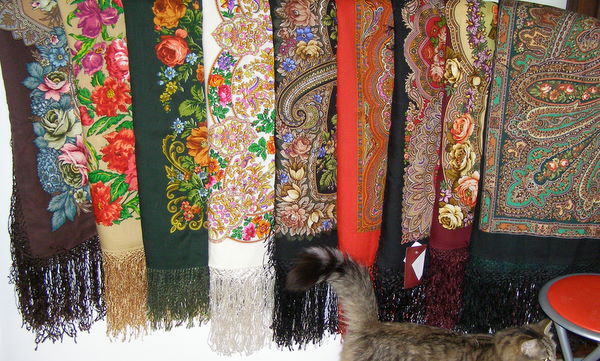 У моей прабабушки, кроме полки в шкафу с "носибельными" платками, был деревянный сундук с кованными ручками полный новыми! с этикетками шерстяными и хлопковыми платками - "про запас" и подарки (ей дарили, она дарила).