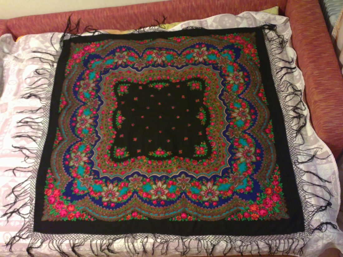 Незнакомку подарил мне муж на рождественской ярмарке в Суздале: я увидела эти яркие цветы и рука сама потянулась к платку. (Кликните, чтобы почитать оффтопик)... Я носила его всю зиму на голове с длинной черной приталенной дубленкой. Теперь - с маленьким черным платьем. Не замерзала в нем и в сильные морозы. Люди порой реагируют на платок неадекватно, но "палец у виска - не дуло револьвера" ;)