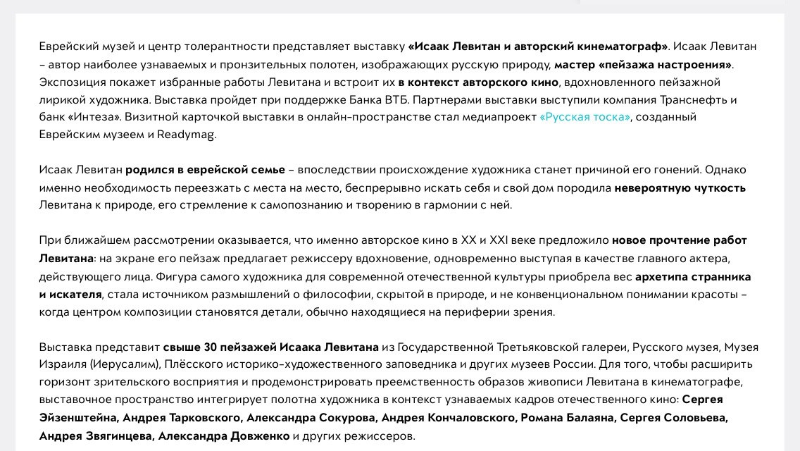Еврейский музей и центр толерантности в Марьиной Роще с 4 октября 2018 года по 20 января 2019 года представляет выставку "Исаак Левитан и авторский кинематограф".