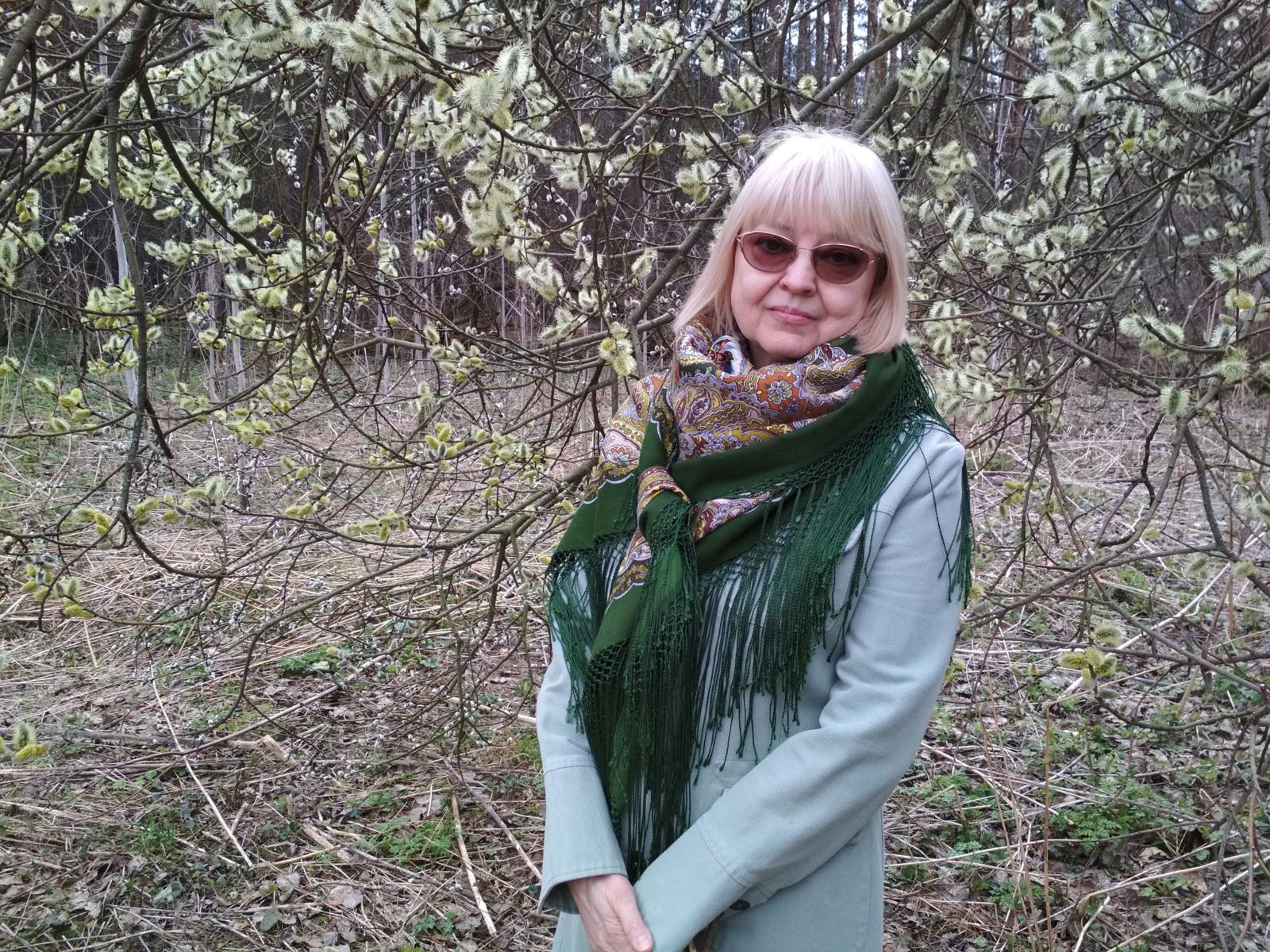 Фон затемнился, а элементы богатой цветочно-орнаментальной композиции видно хорошо, цвет передан верно. Без бахромы и с уменьшенной каймой Настя носит платок с удовольствием