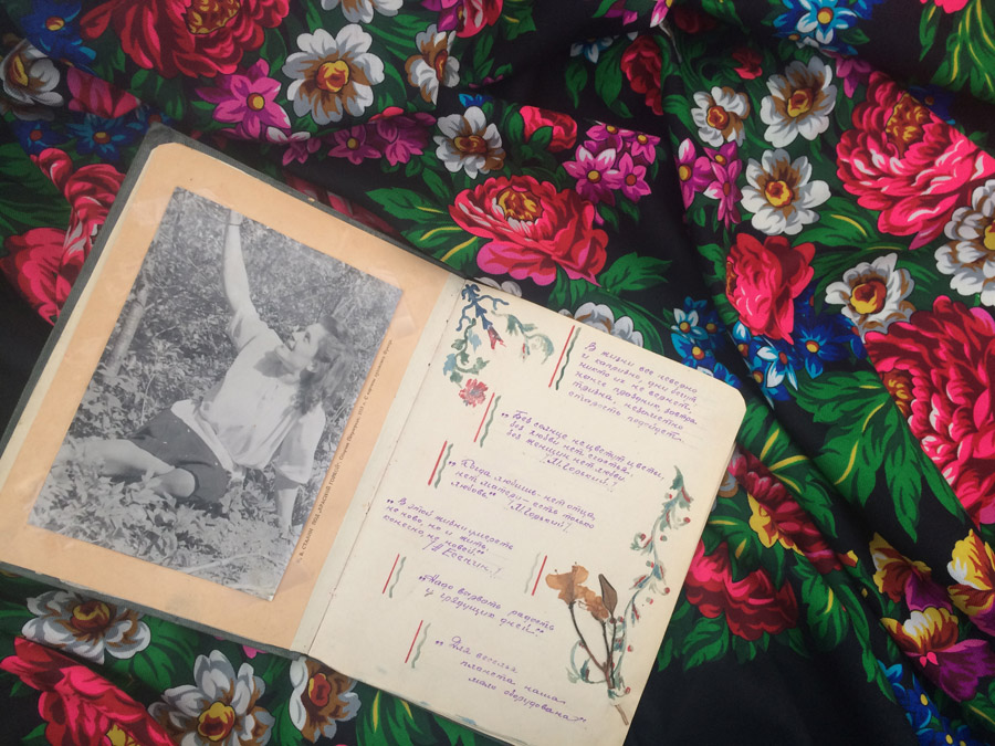 , есть такой альбом и в нашем доме. Только он девичий-моей мамы. Сшитые и разлинееные вручную листки с собственными рисунками и довоенными открытками, вставленными в косые прорези в страничках. Что за цветок засушенный- не знаю, но он там всегда был. Наверное это незабудки. Они обычно крохотные и голубые. Теперь уж спросить не у кого. Но цветам на шали, как и нашей памяти не увять никогда.