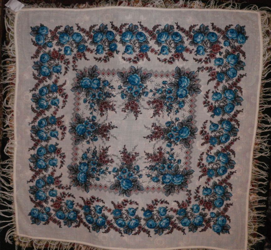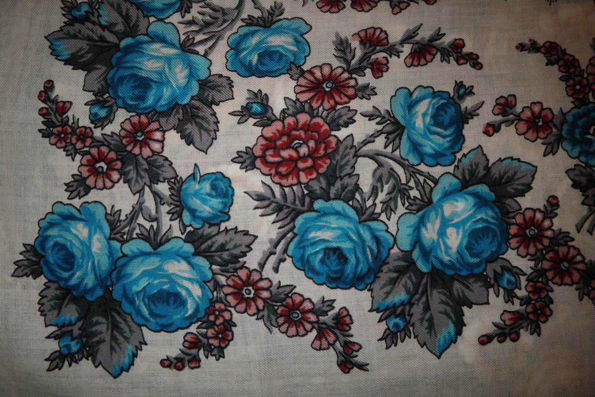 Очень милый платочек. Чудесный теплый ярко-голубой цвет розочек и почти чисто белый фон - прекрасное сочетание! Осбенно понравился тем, что розочки собраны в мелкие букеты. Немного фрагментов: