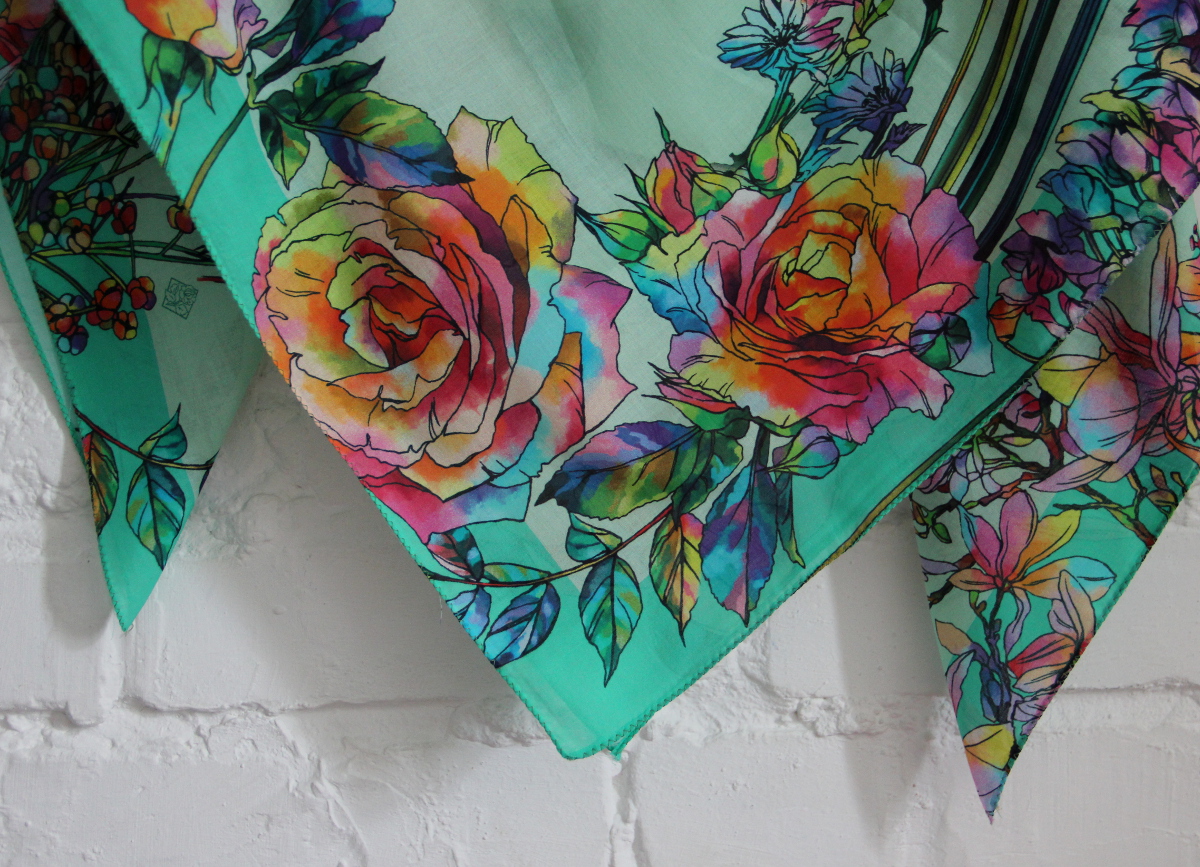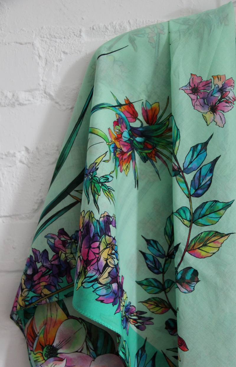 Шикарное качество батиста. Платок я разрежу на две косынки и поделюсь с дочкой. Я, вообще-то, так и мечтала - о косынке с экзотическими цветами.