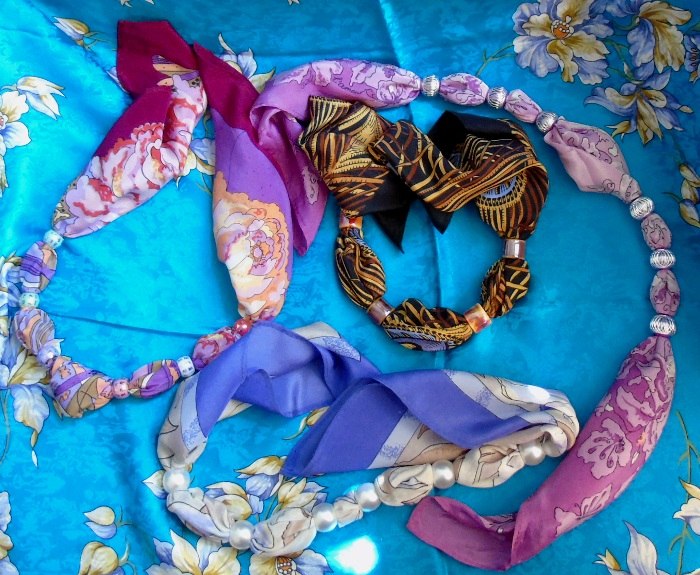 Или просто с одной бусинкой,пропущу в неё концы платочка для закрепления, чтобы маленький объём на узелок не тратить.