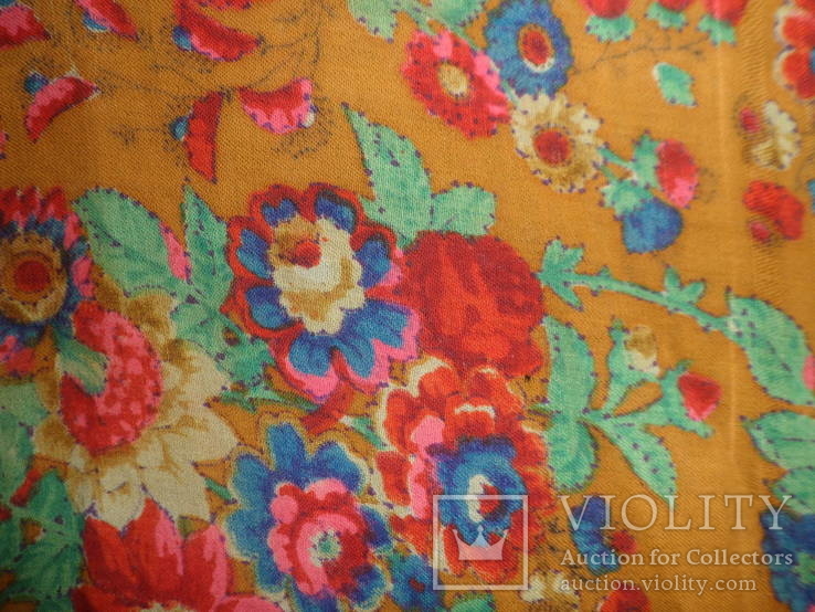 Цветовный мотив по кайме напечатан на шерстяной ткани с шёлковыми просновками