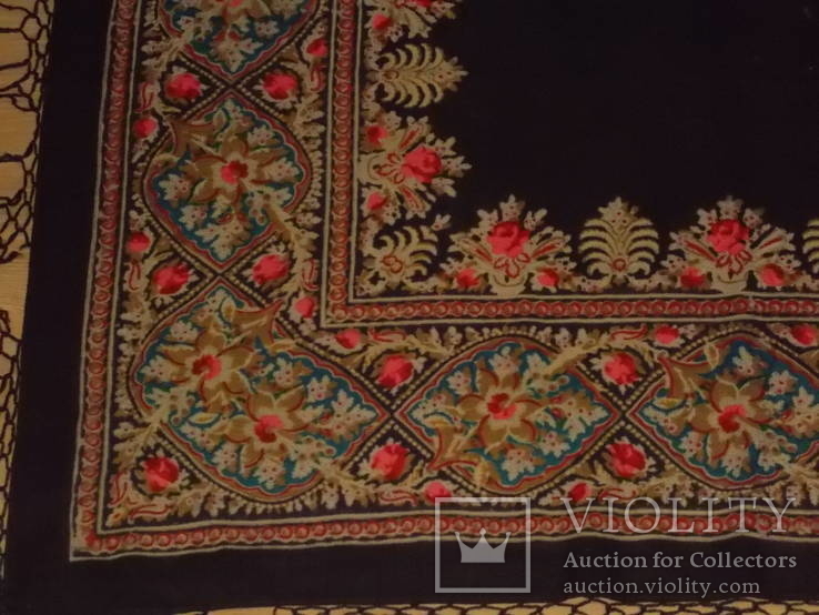 Цветовный мотив по кайме напечатан на шерстяной ткани с шёлковыми просновками