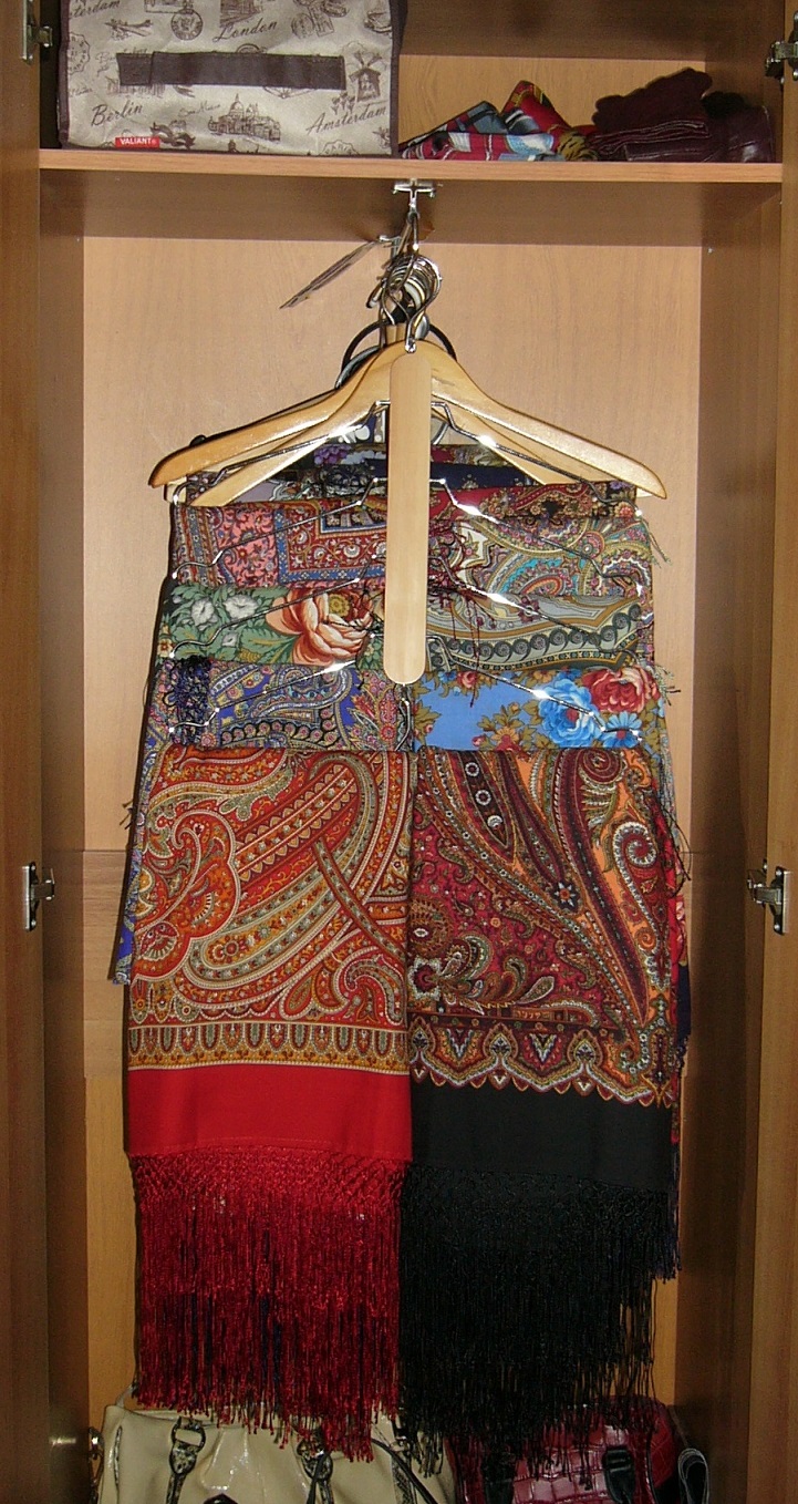 Правда ещё + + 16 шёлковых шалей ( люблю их очень!), 5 палантинов, 3 платка 125х125 и шелковых платочков 4 шт. (Кликните, чтобы почитать, что спрятано под катом)...