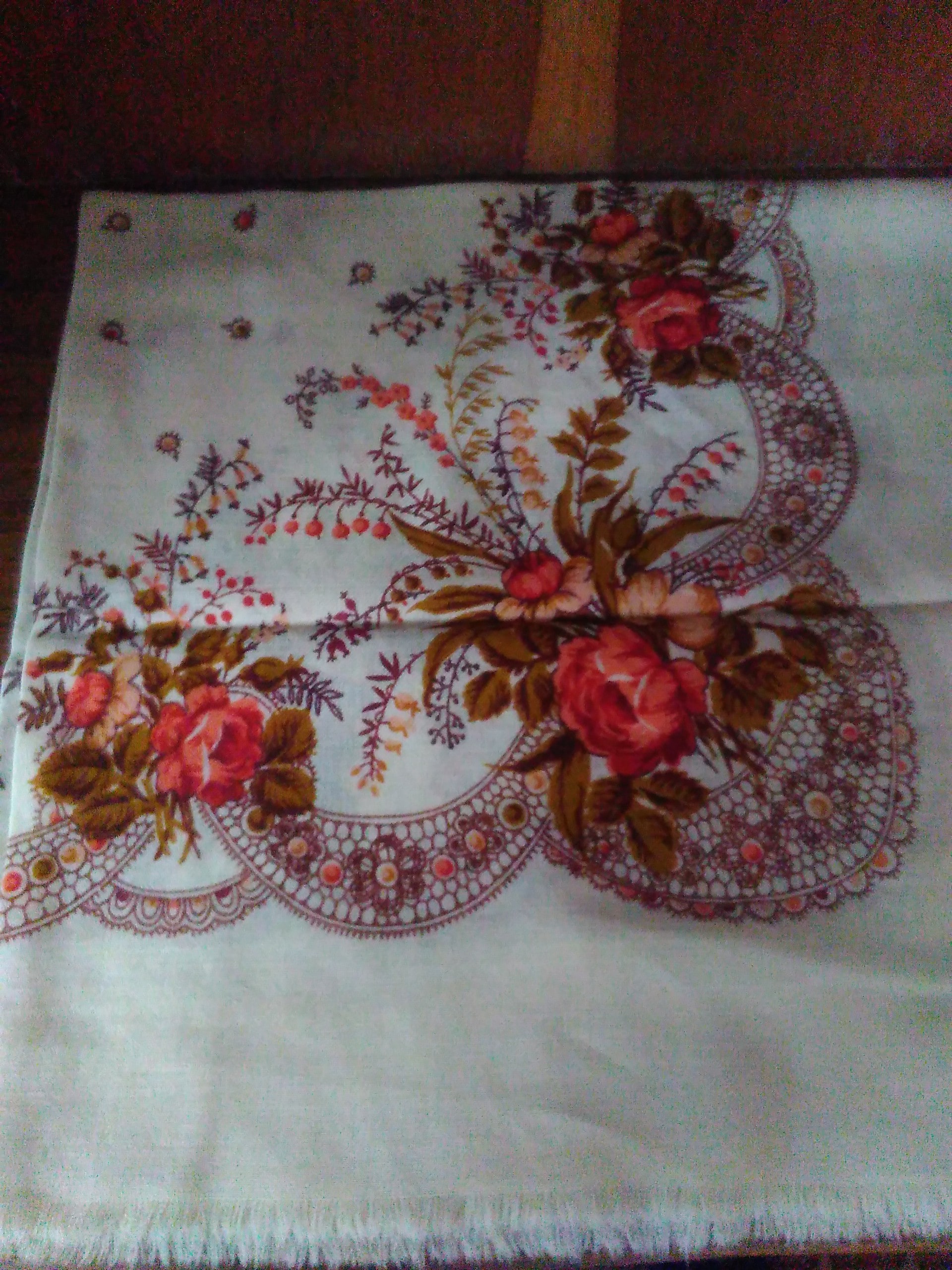 Прошу помощи в опознании : размер, вероятно, 146-148. Реальный цвет желтовато-кремовый, шерстяная вязаная бахрома в 3 ряда. По словам владелицы : (ориентировочно) дата приобретения 1978-1980 гг.