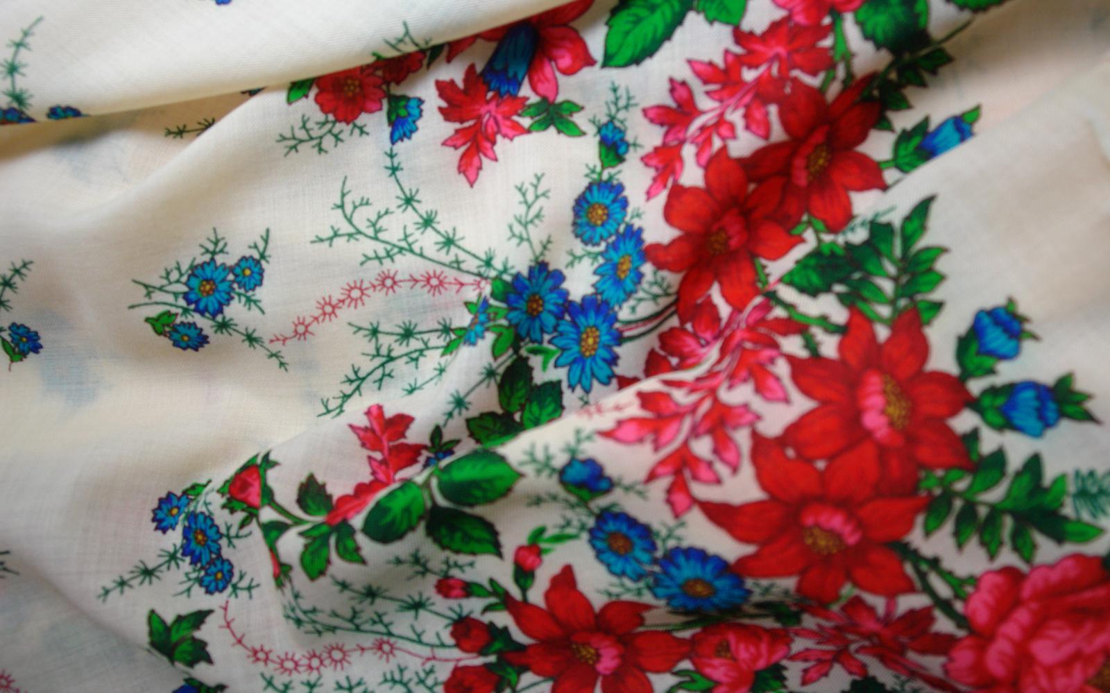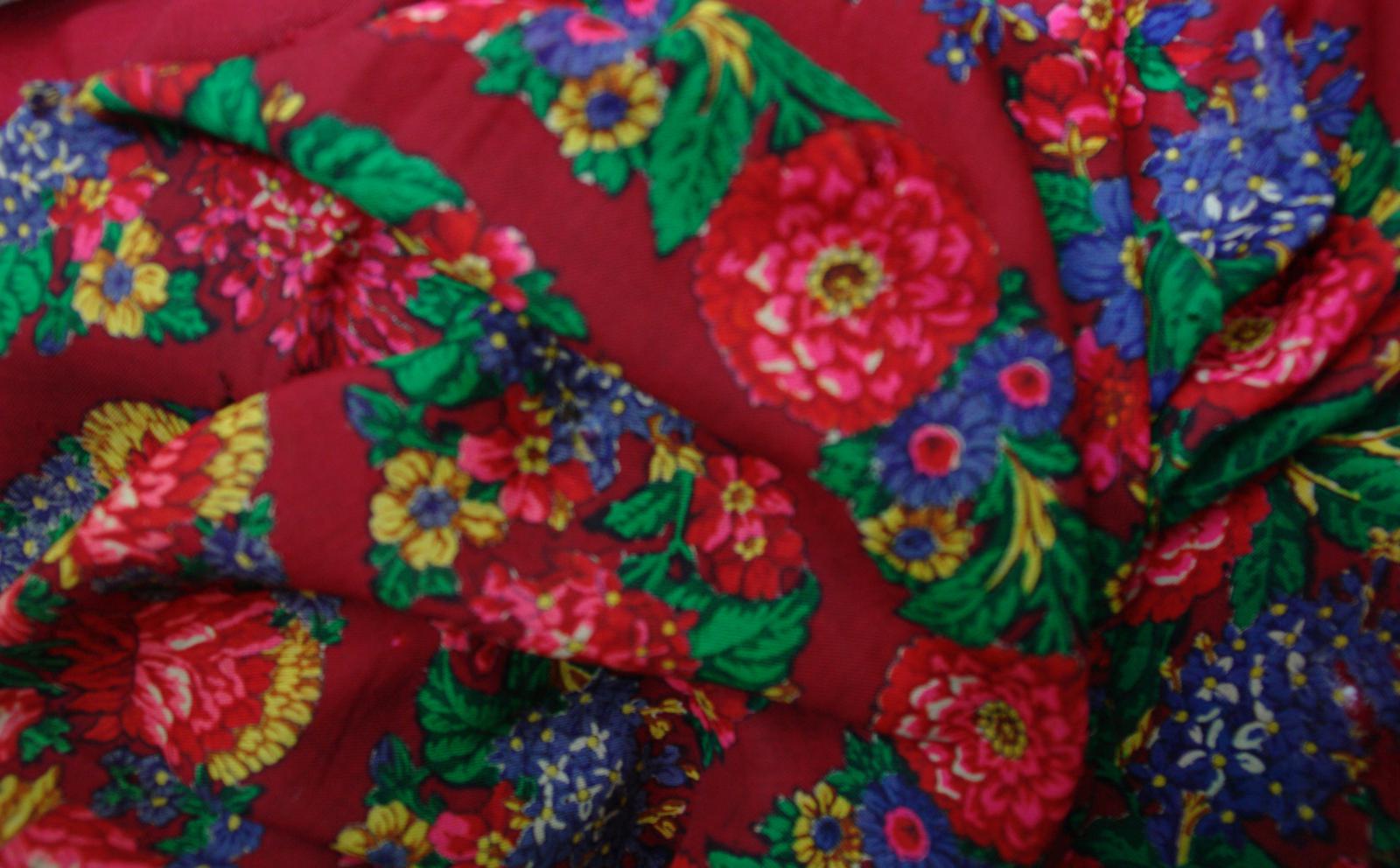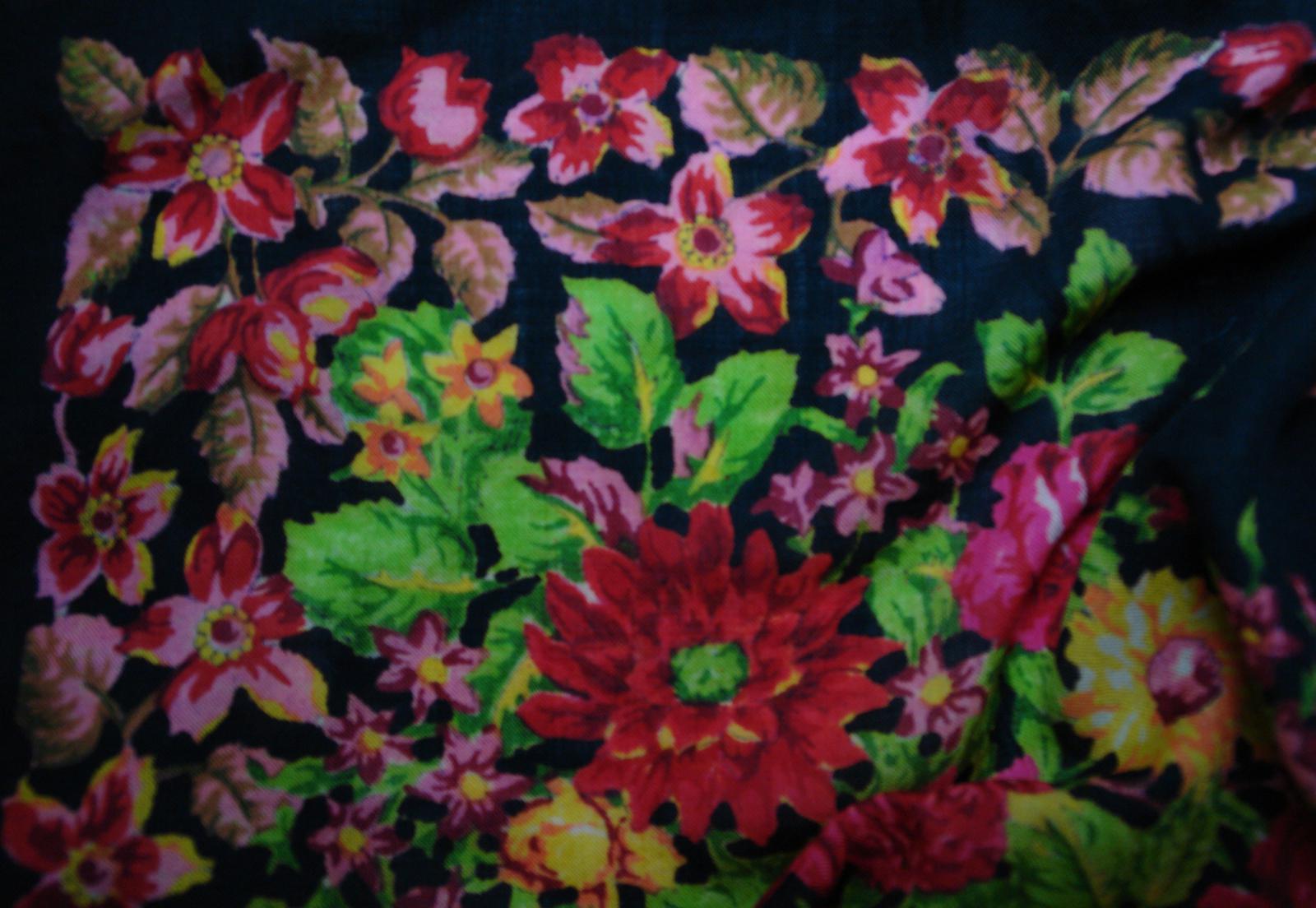Шаль довоенной ручной набойки с цветочным мотивом по кайме