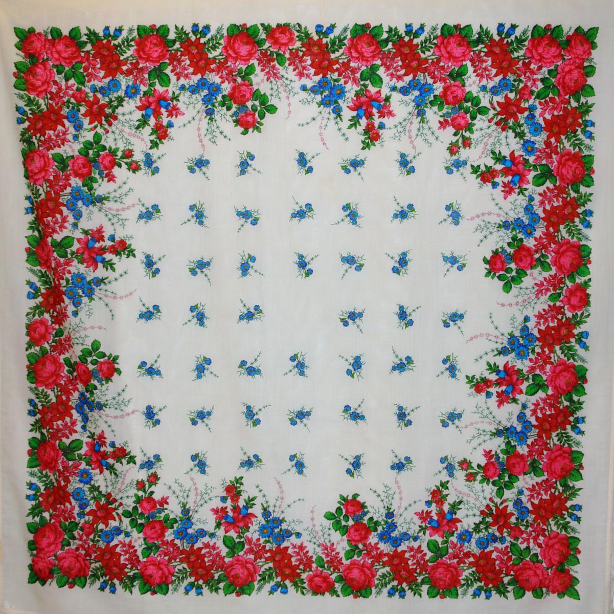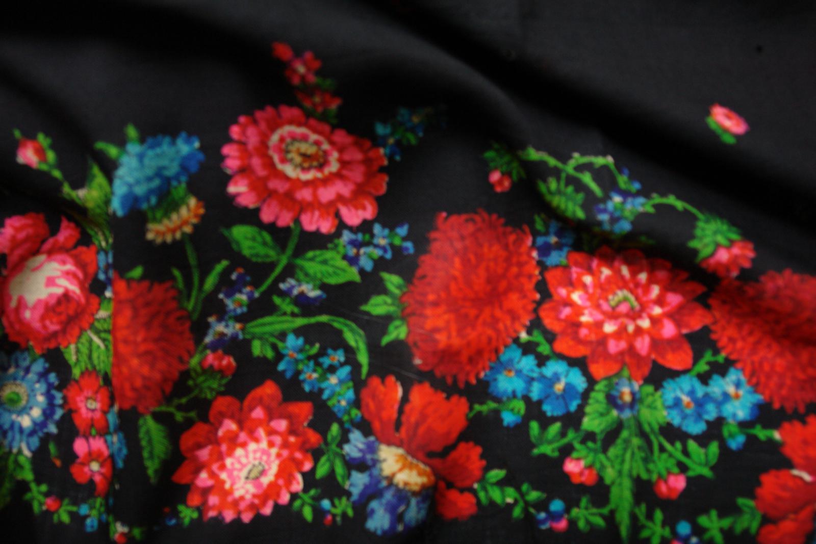 Шаль довоенной ручной набойки с цветочным мотивом по кайме