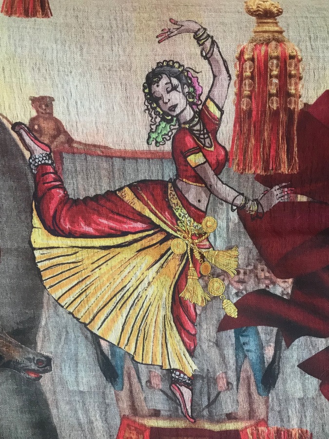 Первое что пришло на ум, при примерке--"Шапито", арт-деко, "ревущие 20-е"-- (Кликните, чтобы почитать оффтопик).... Палантин красивейший, особенно кому подходят такие оттенки, которых миллион. Очень акварельный, сочный. Как ни билась--камера не передает точные цвета. Основные оттенки фона глубокие (на фото выбеленные)--банан, розовый персик (необыкновенной красоты, без детскости), тыква, дыня. Поначалу не понравился огромный слон, но он легко драпируется. Цвет слона не серый, а бурый, серо-зеленый.Из акцентов--оттенки чистого, теплого изумруда ,зеленки, травы, сизый. (Еще фото выложу в примерочную)