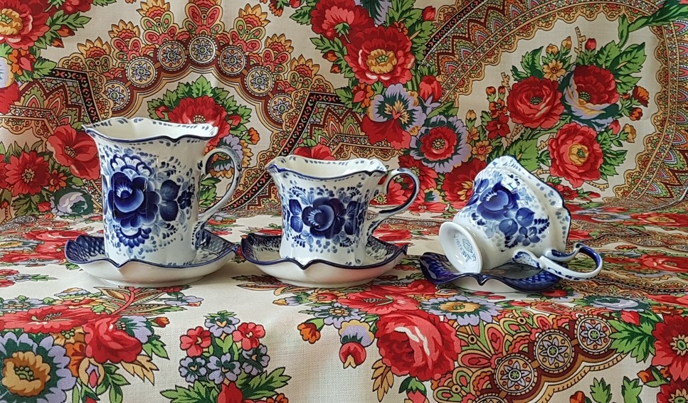 Но мы из гжели чай не пьём по причине специфического восприятия напитков - много лет были под влиянием восточных традиций чаепития: китайской, отчасти японской. От этих влияний осталась привычка пить хороший чай, чаще всего "проливая" несколько раз (от 2 до 12), малыми порциями с добавками. И заваренный с травами чёрный чай мы так пьём - малыми порциями, доливая, хотя и дольше настаивая. Чашки чайные используем более, скажем так, пиаловидные, в разных вариантах (турецкий чай - особая статья, тоже свой способ приготавливать и пить). Гжель - это другая эстетика - тут надо доверху!)) А "доверху" - это в моём восприятии про кофе, компот и прочий квас. Вот умеренного или небольшого объёма гжель для хорошего полновесного кофе с молоком используем, но не для "маленького крепкого".