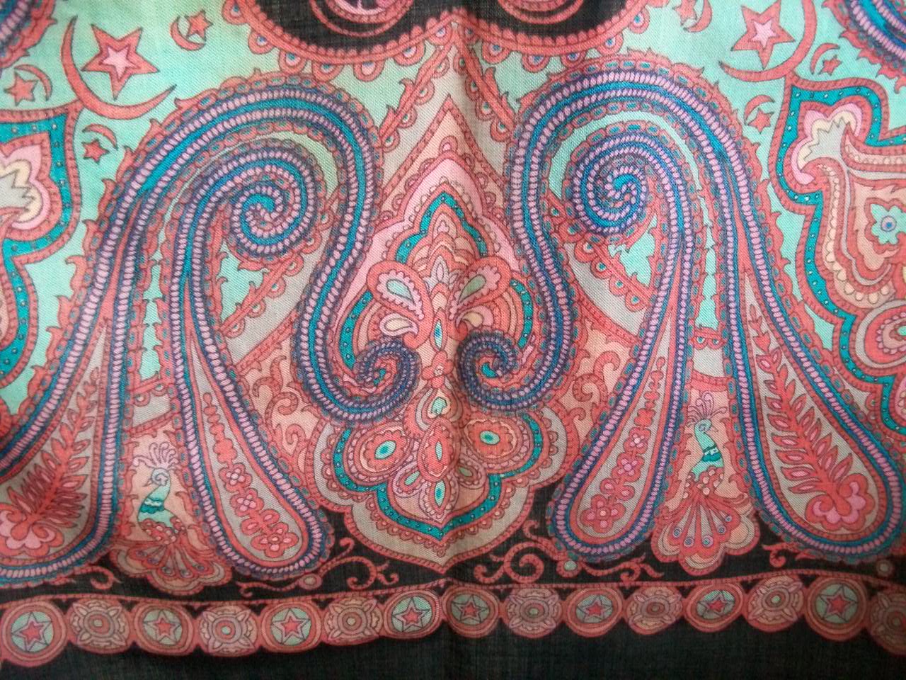 Такое ощущение, что платок постирали в стиральной машине стиральным порошком, потому что ткань незаношенная, без дырочек и затяжек, а краски потускневшние.