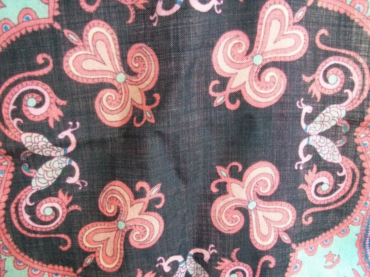 Такое ощущение, что платок постирали в стиральной машине стиральным порошком, потому что ткань незаношенная, без дырочек и затяжек, а краски потускневшние.