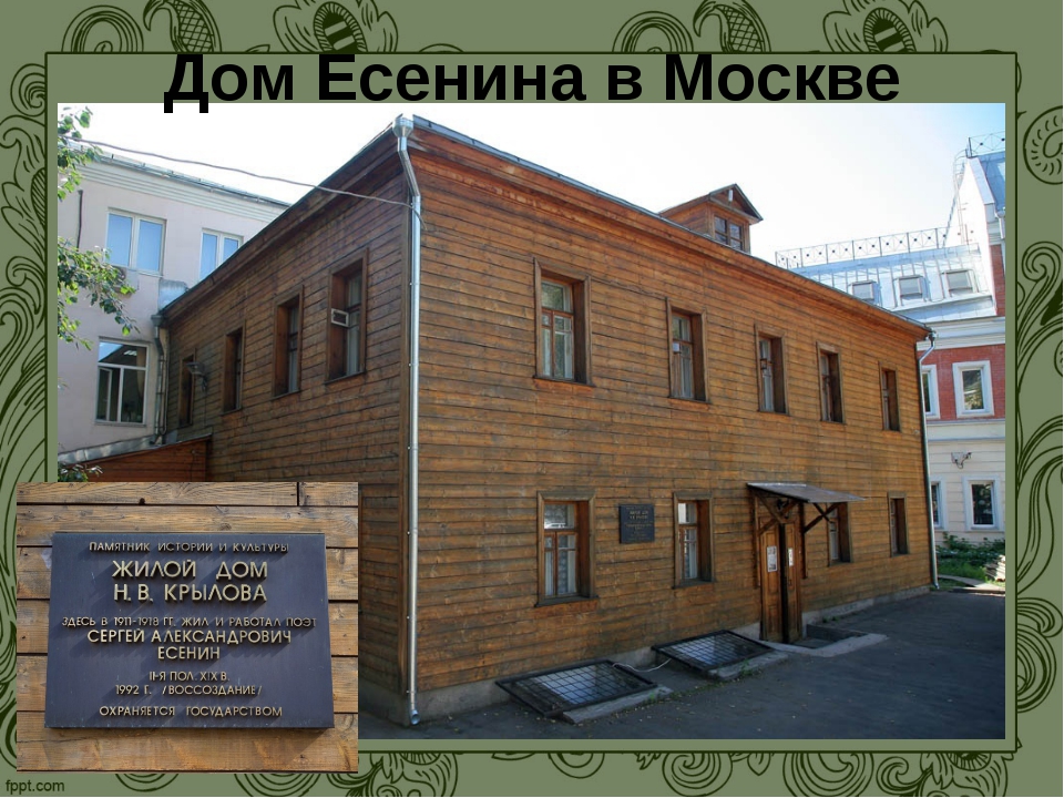 1 -"Обвалившийся деревянный дом" - это дом, где в Москве жил Сергей Есенин. Теперь там музей Есенина.