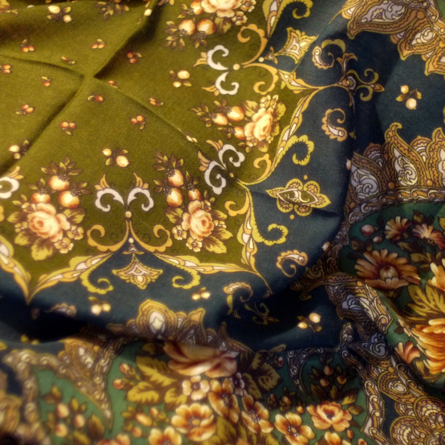 Девочки, в Адыгее, а именно в худ.салоне г. Майкопа откопала Сонату Надежды Слащевой, раритетов в продаже не было, этот платок висел на стуле, он когда-то залежался и его на углах слегка моль покусала, но состояние вполне. Я его у них купила за 500р, надо будет только простирнуть все-таки, а то там за столько лет пыли накопилось.