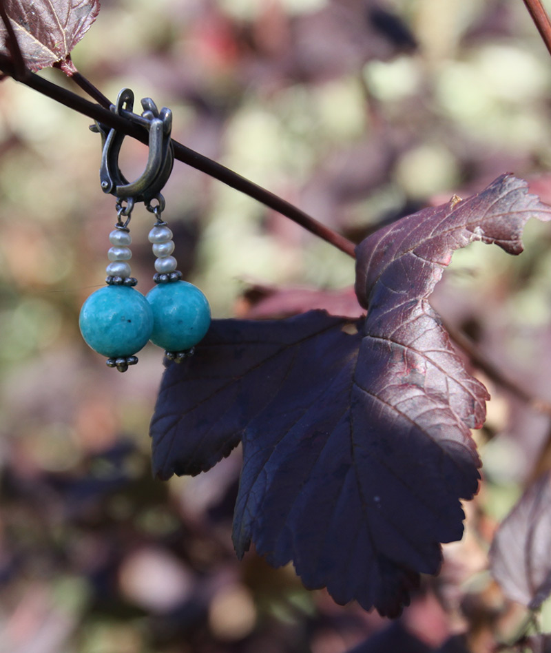 Сережки с амазонитом и жемчугом, цвет яркий, бирюзовый, но блеск амазонитовый, поэтому с бирюзой не спутаешь. Легкие, подходят почти под все мое, люблю.