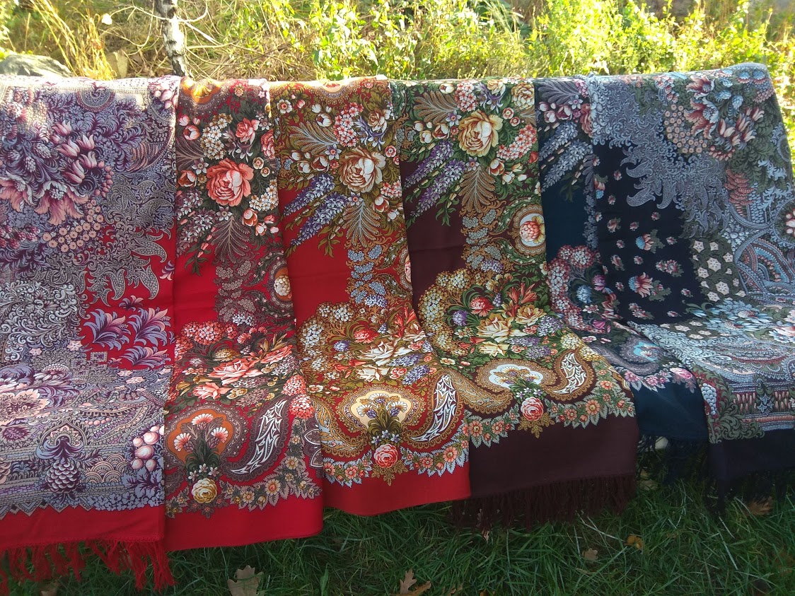 В ожидании своих новинок и перекладывания платков в эти выходные обнаружился хор Турецких: два 5-х колорита и на шоколадном фоне( быть может и 17-ый(условно). Качество ткани у всех разное, ведь выпускались в разные года, самый теплый .пожалуй. шоколадный, но он мягкий .