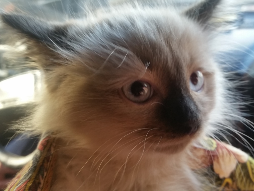 По виду котенок похож или на сиама, но пушистый, или на котенка Невской маскарадной. Прям один в один.