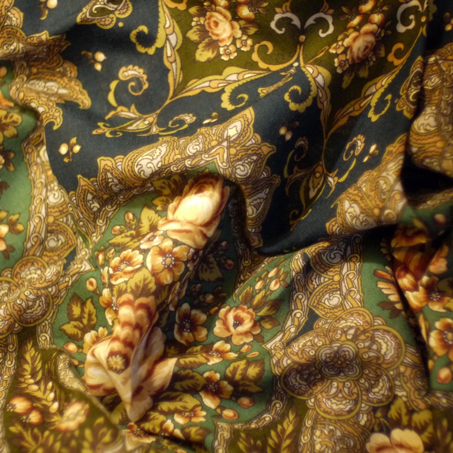Девочки, в Адыгее, а именно в худ.салоне г. Майкопа откопала Сонату Надежды Слащевой, раритетов в продаже не было, этот платок висел на стуле, он когда-то залежался и его на углах слегка моль покусала, но состояние вполне. Я его у них купила за 500р, надо будет только простирнуть все-таки, а то там за столько лет пыли накопилось.