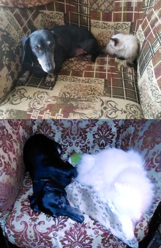 Феликс стал сам присматриваться и заигрывать с Ричем. Но пока так : Я могу заигрывать и прыгать тебе на спину с кресла, а ты нет" Но дистанция все сокращается и шипит уже реже.